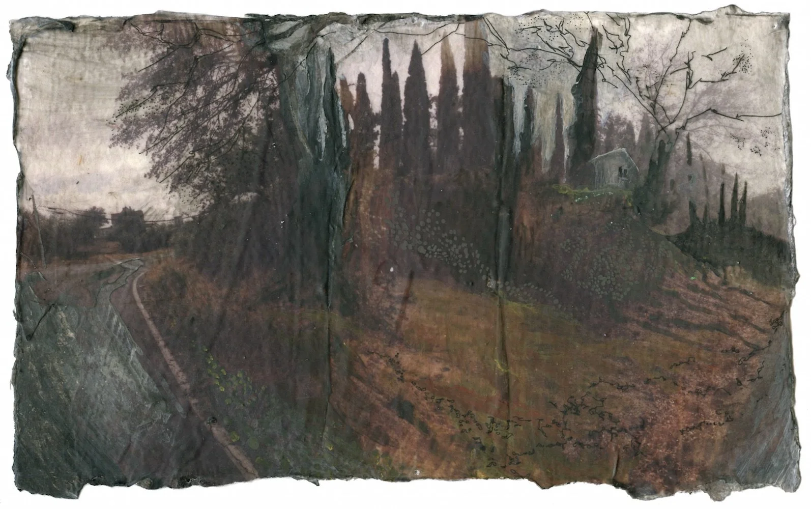 Cypress July 2014. Aprox. 6.5x10.25", photo transfer, acrylic, pen and inkLocation: Oracle, ArizonaDone during a 2014 artist residency at Rancho Lindo Vista.