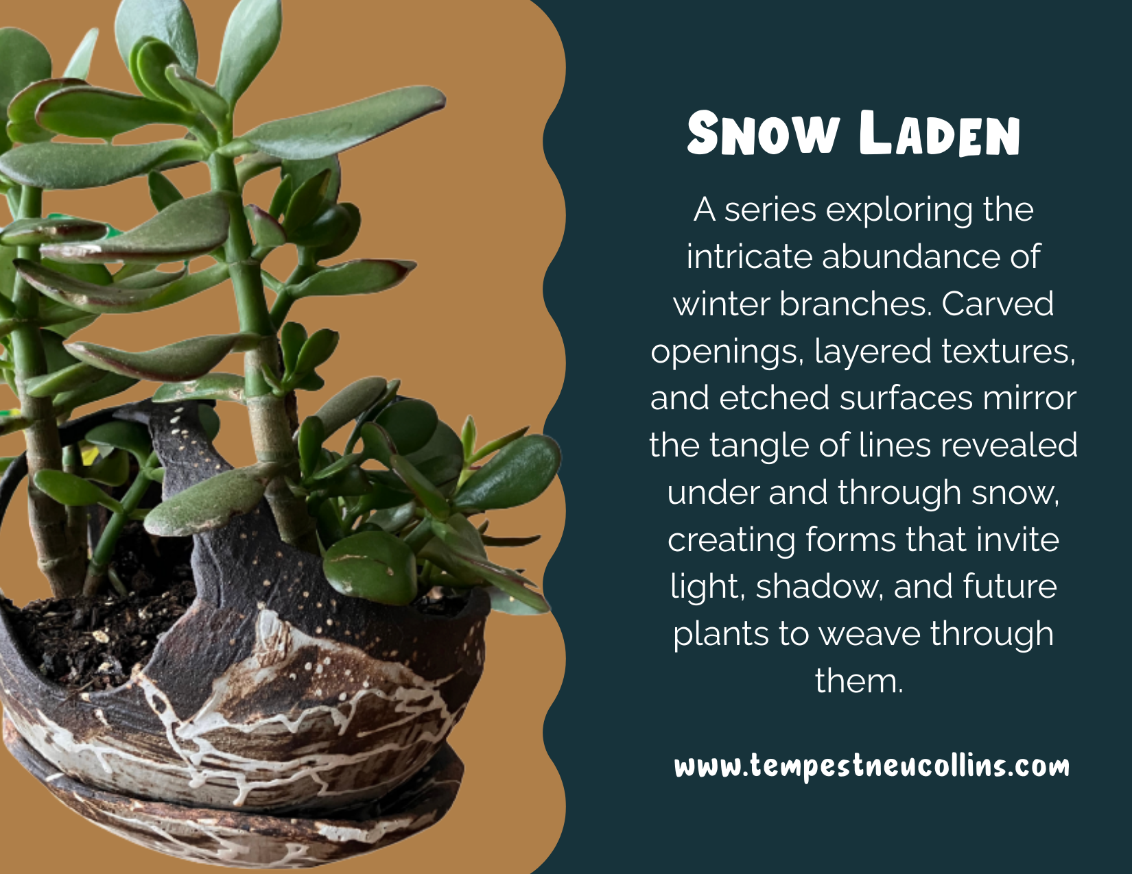 Rooted in a fascination with wintry branches and the quiet complexity of natural forms, the Snow Laden series reflects subtle textures, winding lines, and organic rhythms inspired by snow-laden limbs and winter landscapes. Each pot is built with Black Mountain and Panoma clay, fired to cone 10, and finished with layered slip and white underglaze for depth and quiet visual movement.